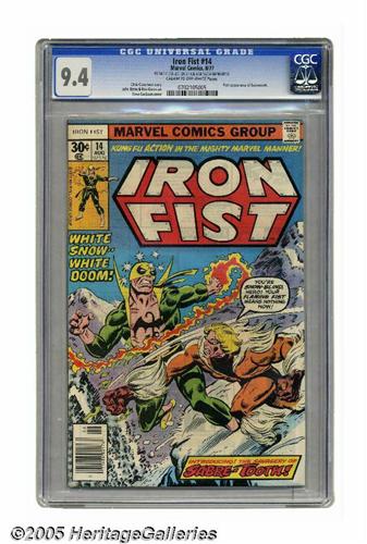<B>Iron Fist #14 (Marvel, 1977) CGC NM 9.4 Cream to off-white pages.</B></I> An incredible copy of the first appearance of Sabretooth, one of the most popular villains of the past 25 years. Even though he started out fighting Iron Fist, he has been Wolverine's nemesis for many years, and has played an important role in the various X-Men titles as well. Overstreet 2005 NM- 9.2 value = $160. CGC census 7/05: 144 in 9.4, 92 higher. <I>From the collection of Joe and Nadia Mannarino.</B></I>
