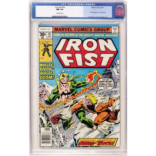 <B>Iron Fist #14 (Marvel, 1977) CGC NM 9.4 Off-white pages.</B></I> First appearance of Sabretooth. John Byrne art. Dave Cockrum cover. Overstreet 2006 NM- 9.2 value = $175. CGC census 3/07: 195 in 9.4, 122 higher.<BR><BR><b>Shipping:</b> Comics - Slabbed (certified) (<a target="_blank" href="http://www.heritageauctions.com/common/shipping.php">view shipping information</a>)