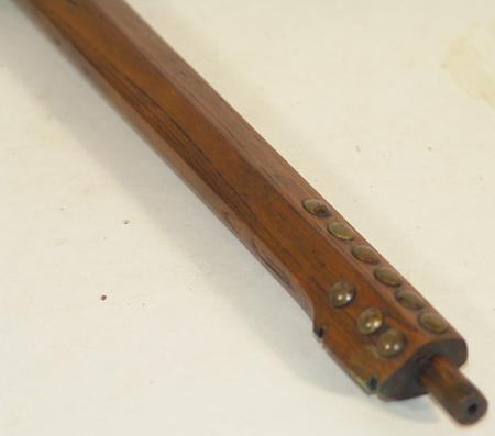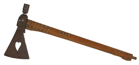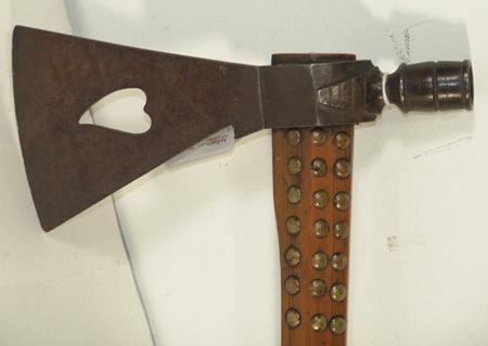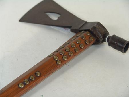 Beautiful forged iron pipe/axe head with bleeding heart cutout and carved oak stem adorned with traditional brass tacks. Excellent condition, aged, beautiful visual display.