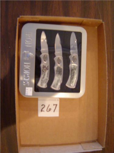 Three pice set, 5.5" lock-back pocket knives. Steam Locomotive Motif with metal display box.