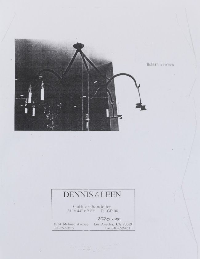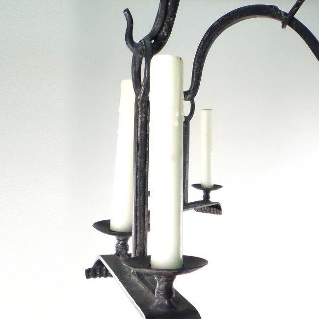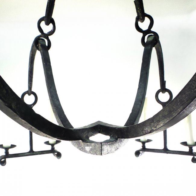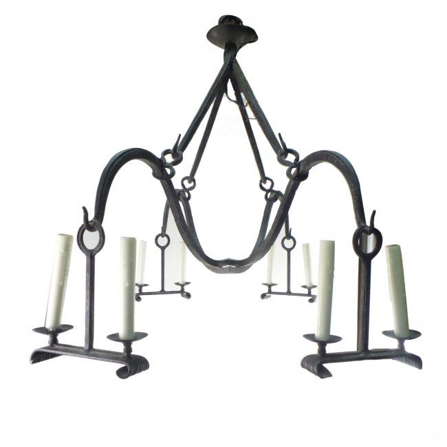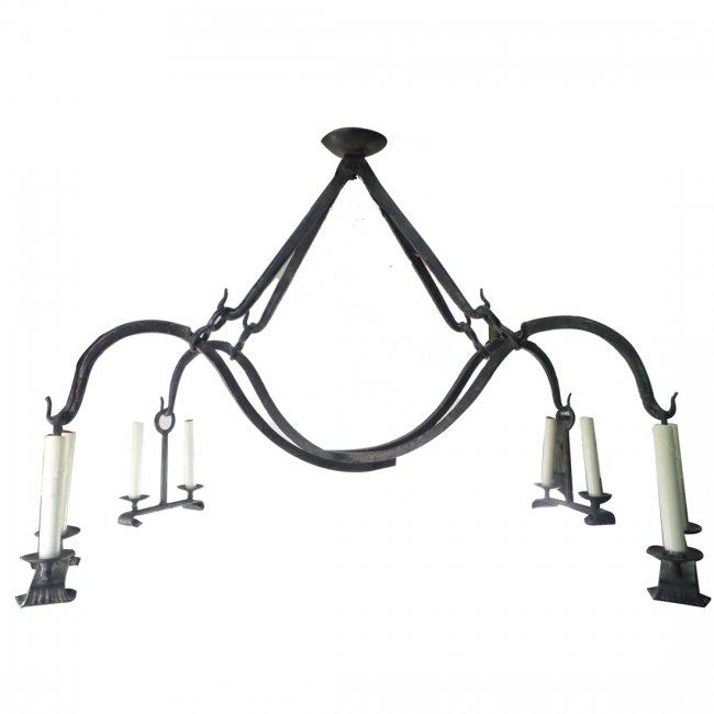 Eight-light black iron fixture. [Approx: 35" x 24" x 28 1/2"].