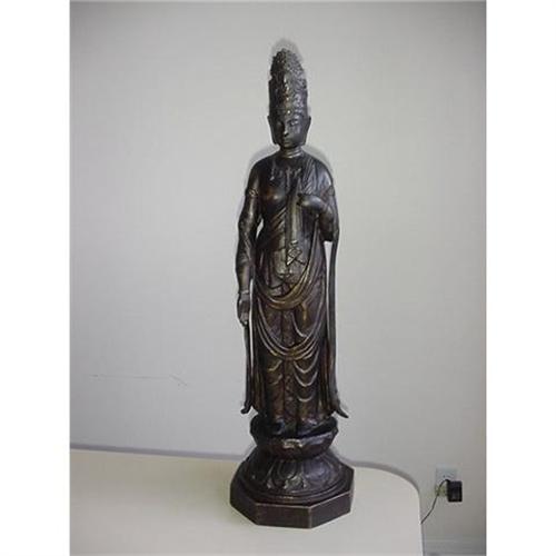 Iron Statue of Kwan Yin. 32 1/2" tall x 9 1/2" wide. Bronze patina. The flower that was originally in her hand is missing but does not detract from her beauty.