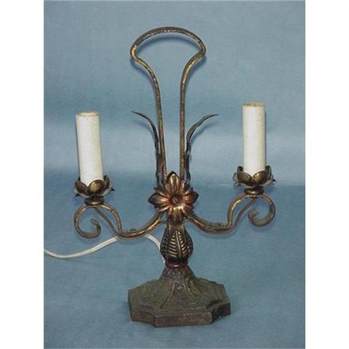 A 1920's painted iron lamp, 11 1/2" tall, 8" wide. Electric double candle lamp, originally probably one of a pair, but now stands alone, will be a great lamp for a small deck or side table, condition is good, could use a good cleaning to brighten up the remaining paint. Small hole in the top of the lamp may have held a finial, now missing.