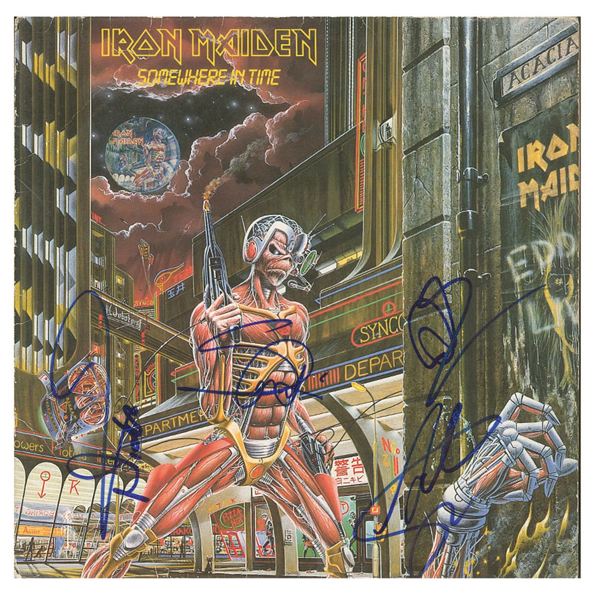 Somewhere in Time album signed on the front cover in blue felt tip by Steve Harris, Adrian Smith, Dave Murray, and Nicko McBrain. Mild ‘ring of wear’ and some scattered creasing, otherwise fine condition. The record is not included.