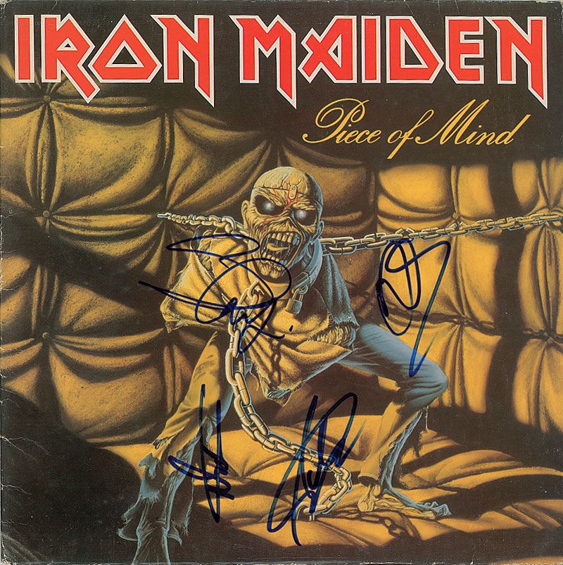 Piece of Mind album signed on the front cover in blue felt tip by Steve Harris, Dave Murray, Adrian Smith, and Nikko McBrain. In fine condition, with some scattered light cover wear. The record is not included.