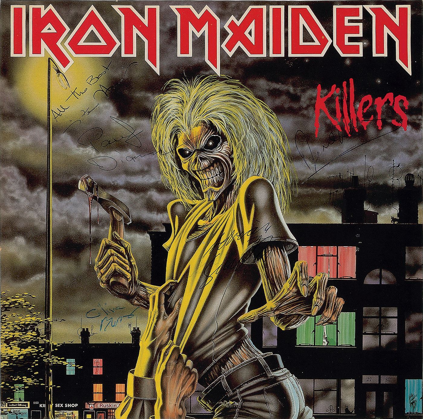 KIllers album flat signed on the front in black and blue ballpoint, "All the best, Steve Harris," "Paul Di'Anno," "Clive Burr," "Adrian Smith," and "Dave Murray." In fine condition. A classic album cover with a complete early Maiden lineup.