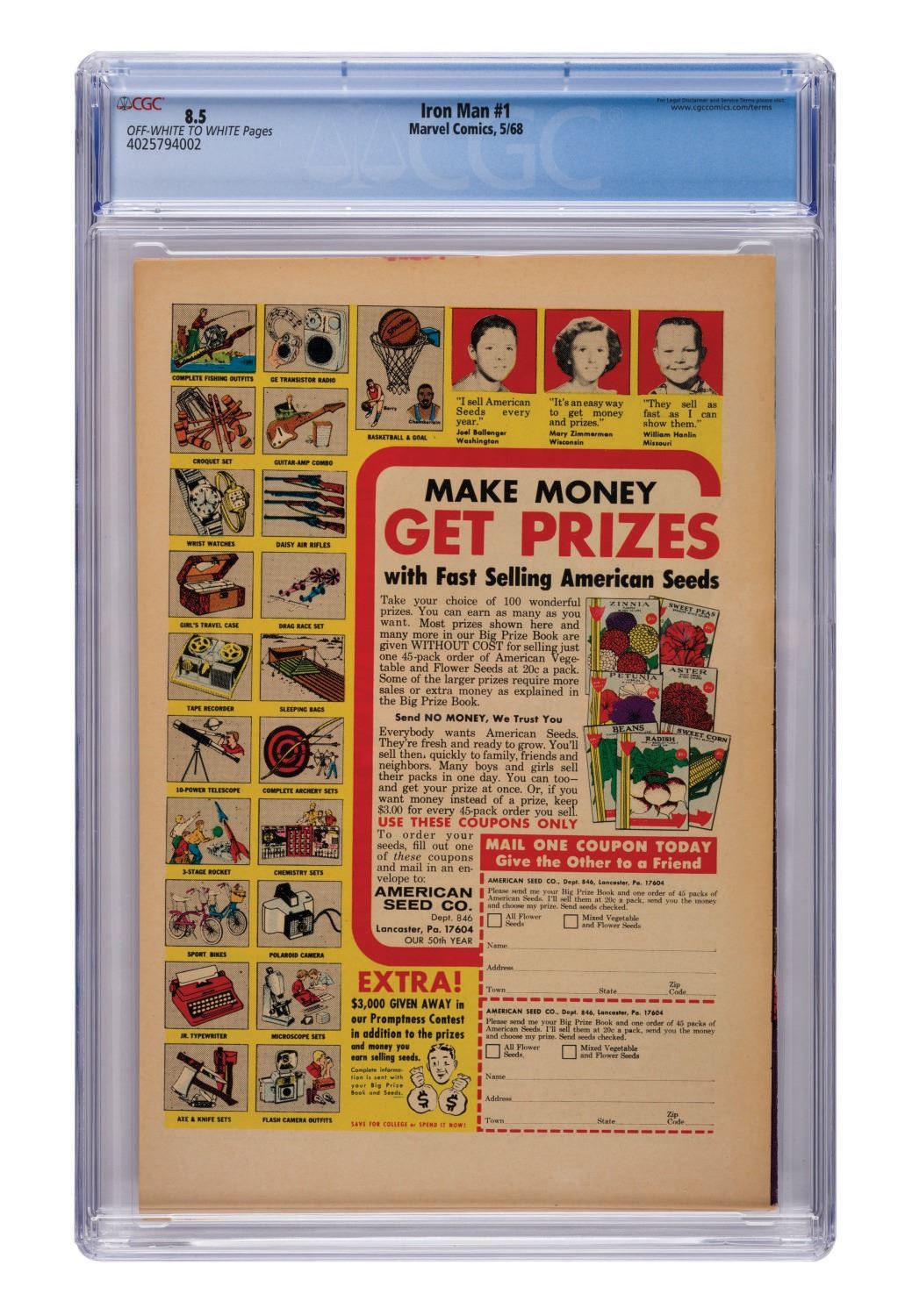 (Marvel, 1968) An extremely rare issue of Iron Man #1. Iron Man made his debut in Tales of Suspense #39, March 1963, and was featured there until moving to his own book in May of 1968. This first issue of his solo title retold his origin story, with script by Archie Goodwin and art from Gene Colan and Artie Simek. Rated by CGC as 8.5, TK