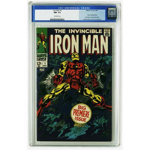 <B>Iron Man #1 (Marvel, 1968) CGC NM- 9.2 Off-white pages.</B></I> Iron Man became so popular from the <B>Tales of Suspense</B></I> series that Marvel gave Shellhead his own title. In this first issue, Iron Man's origin is retold. Gene Colan drew the cover art. Colan and Johnny Craig (of EC fame) handled the interior art. Attractive copy. Overstreet 2005 NM- 9.2 value = $575. CGC census 12/05: 93 in 9.2, 145 higher.