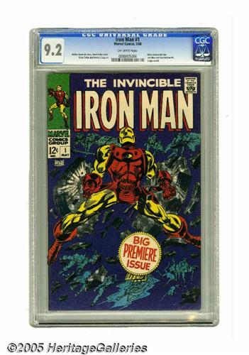 <B>Iron Man #1 (Marvel, 1968) CGC NM- 9.2 Off-white pages.</B></I> In this first issue of his own book, Shellhead took on the secret, omnipresent organization known as A.I.M. as well as the, er, secret, omnipresent organization known as the Maggia. Gene Colan drew the cover as well as both stories (the other is a retelling of the hero's origin). Overstreet 2005 NM- 9.2 value = $575. CGC census 3/05: 89 in 9.2, 140 higher.