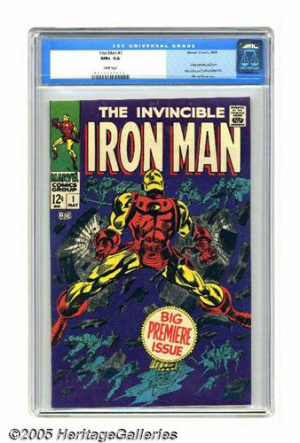 <B>Iron Man #1 (Marvel, 1968) CGC NM+ 9.6 White pages.</B></I> In the first issue of his own title, Iron Man took on the organization known as A.I.M. The backup feature is a retelling of Shellhead's origin. Both stories were penciled by Gene Colan and inked by Johnny Craig. Overstreet 2005 NM- 9.2 value = $575. CGC census 6/05: 35 in 9.6, 20 higher.