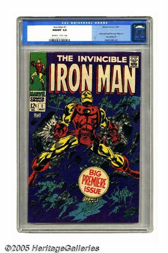 <B>Iron Man #1 (Marvel, 1968) CGC NM/MT 9.8 Off-white to white pages.</B></I> Iron Man rocketed into his own comic here after many months of sharing a mag with Captain America. Gene Colan drew the cover as well as both stories: one was a retelling of the hero's origin, the other had Shellhead facing two organizations that he seemingly never stopped fighting: AIM and the Maggia. Overstreet 2005 NM- 9.2 value = $575. CGC census 7/05: 18 in 9.8, 2 higher.