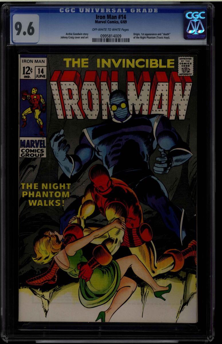 Iron Man #14 CGC 9.6 off-white to white. Archie Goodwin story Johnny Craig cover and art of the Night Phantom (Travis Hoyt). Origin 1st appearance and ""death"". Overstreet 2009 9.2 value = $70. CGC universal census reports 15 at 9.6, 1 better.