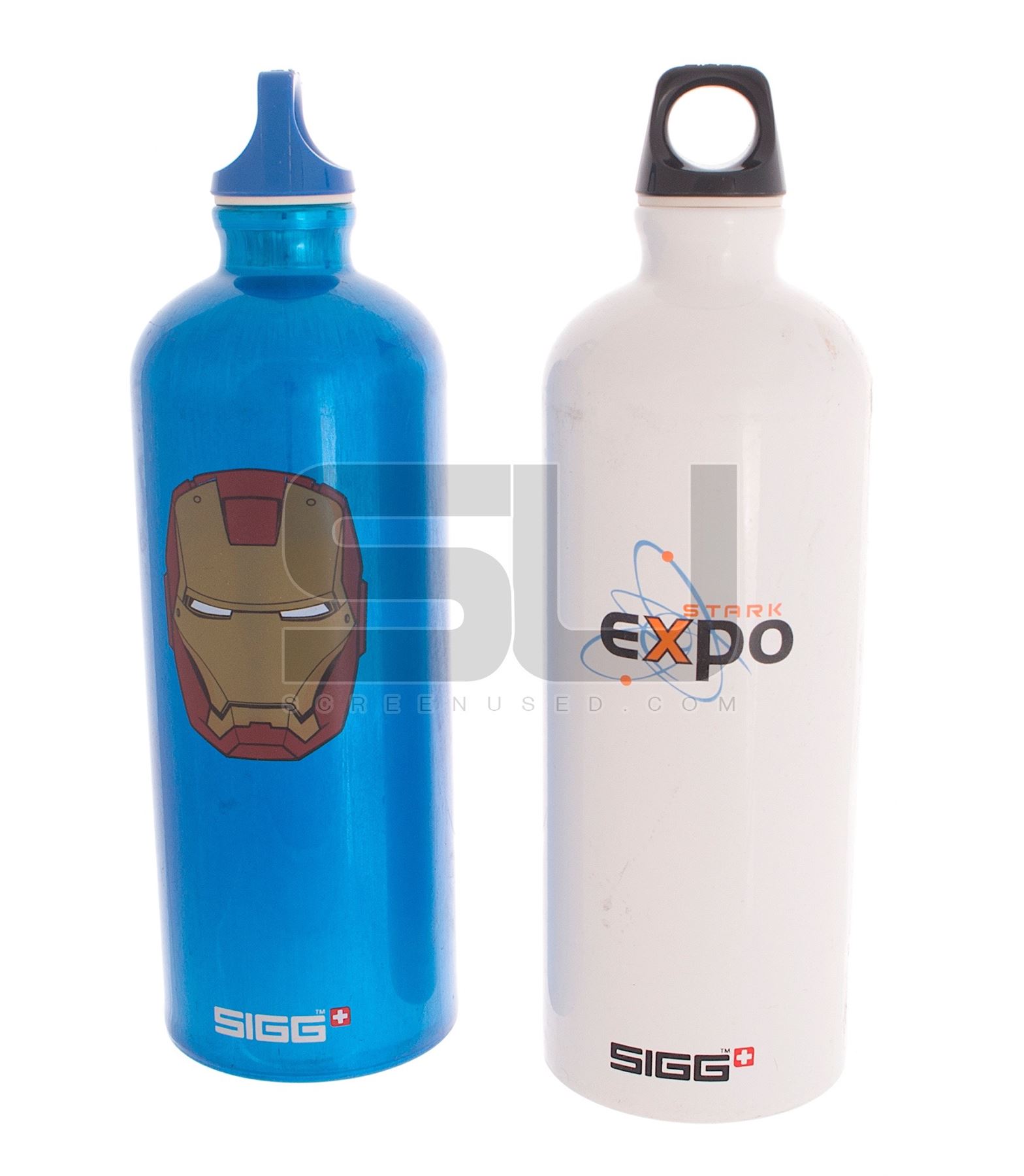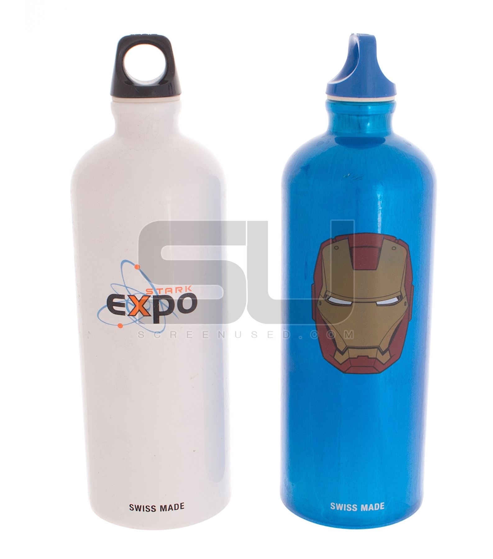These two metal bottles were made by the production for use as set dressing. One bottle is blue with an Iron Man head image and the other is white with Stark Expo decals.