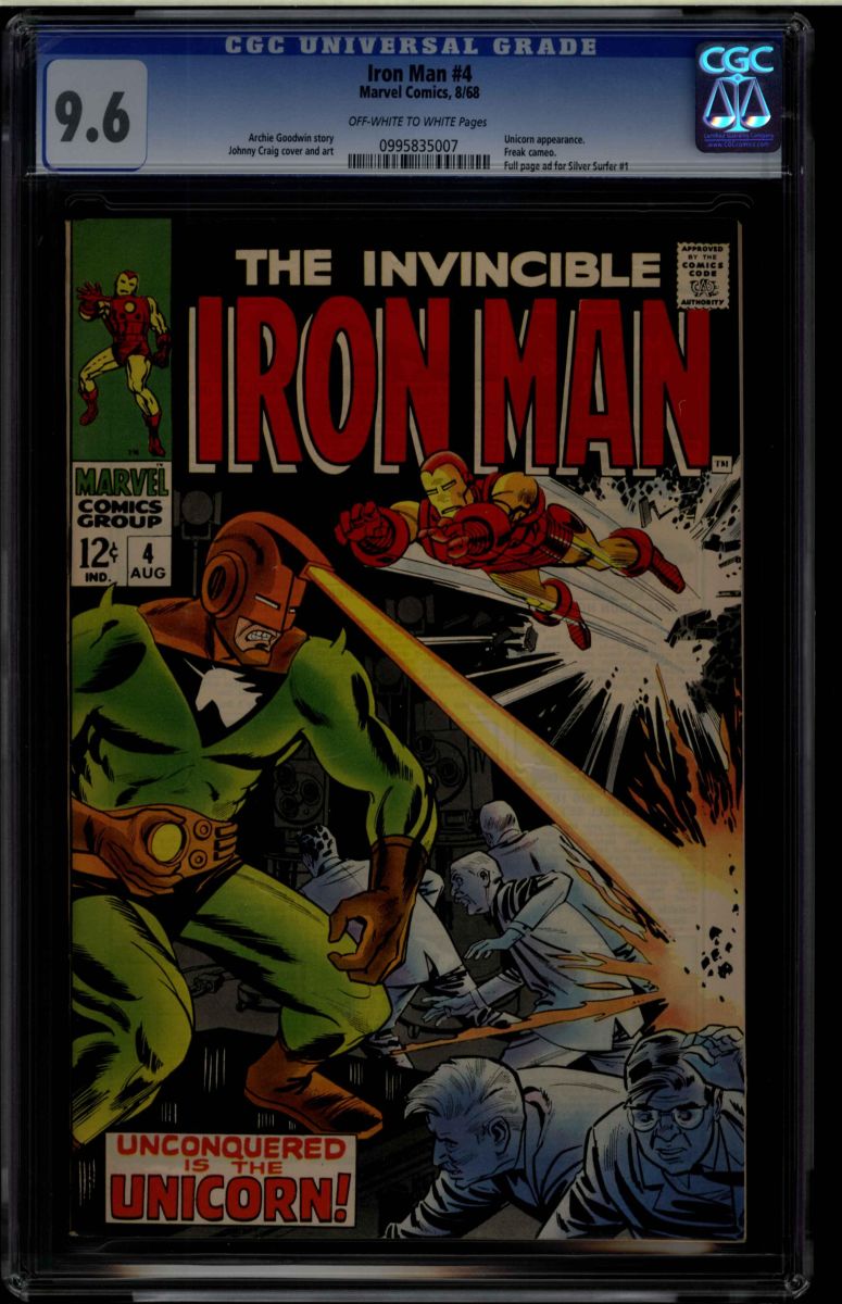 Iron Man #4 CGC 9.6 off-white to white. Archie Goodwin story Johnny Craig cover and art Freak cameo. Full page ad for Silver Surfer #1. Unicorn appearance. Overstreet 2009 9.2 value = $110. CGC universal census reports 13 at 9.6, 8 better.