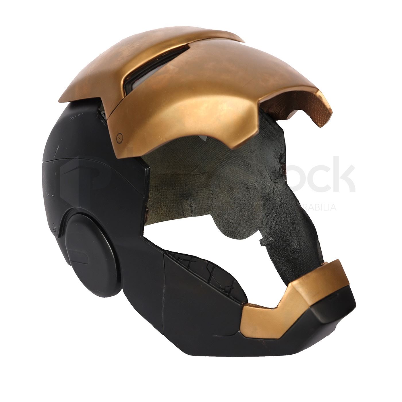 This helmet was created by the studio and would have been used for presentation to the collectible distributor Sideshow Collectibles. This piece was created to the exact standards using the exact same materials and created by the same studio who made the helmets used on screen for the Iron Legion in the third Iron Man Installment, Iron Man III. This item is marked inside as "Mark VI Prototype Sideshow", and although marked as a Mark VI the helmet is actually a Mark VII version that was later used as the Mark XX, or (Mark 20). This helmet is constructed of fiberglass and is three pieces, the main helmet, the neck section and the faceplate, all of which are held together via strong magnets. The faceplate is gold in color and the rest of the helmet is a dark blue as it is unpainted. This piece remains in excellent condition.