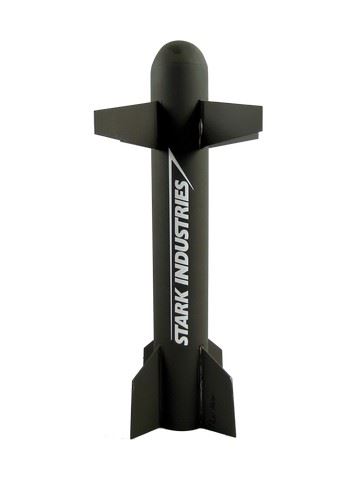 Acquired from the production team of Iron Man (2008) is the production used Stark Industries missile that blew up Tony Stark's car and turned Stark into Iron Man. This missile was used for on-set lighting reference and later CG modeling and photographic surface textures for the CG model. Green wood with Stark Industries on the side prop missile and autographed on the tail wing. Measures approximately 24" long.