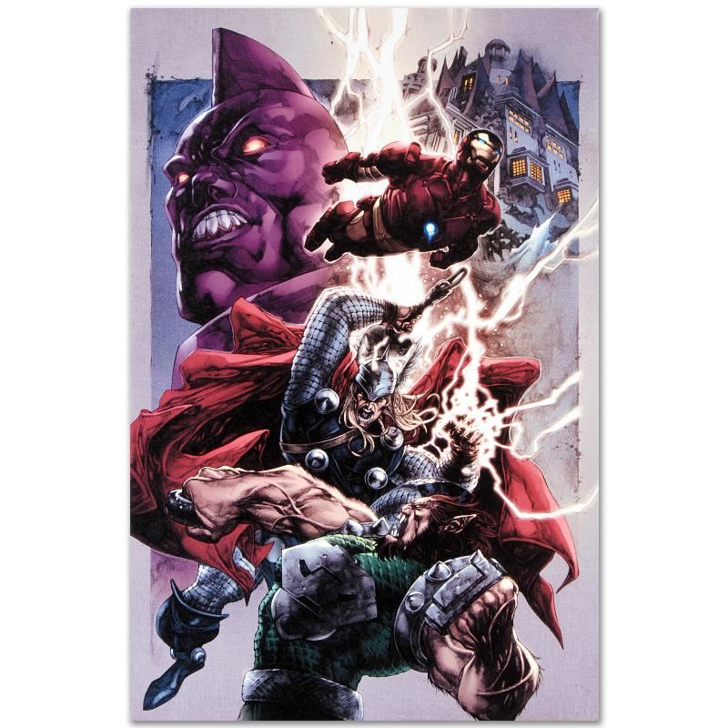 A piece of comic book history, this limited edition, from original art by Stephen Segovia, depicts the classic characters Thor and Iron Man. Stephen Segovia is a comic book artist, illustrator, graphic and concept designs artist, specializing in comic book illustrations. He is currently working on Wolverine Origins for Marvel Comics, Hired Assassins, and A Gun Runner. He has also worked on such titles as Silver Surfer, Mighty Avengers, and Amazing Spider-Man. "Iron Man/ Thor #2" is a limited edition numbered giclee on stretched canvas by Stephen Segovia presented by Marvel Comics. This piece comes gallery wrapped and ready to hang. Includes Certificate 18" x 27" (image); 1.5" (depth).