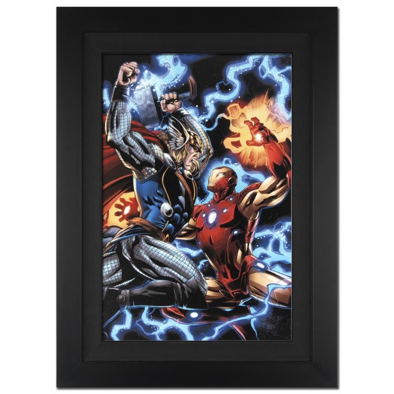 A piece of comic book history, this limited edition, from original art by Scot Eaton, depicts an action packed scene starring Iron Man and Thor. Born and raised in Vermont, Scot Eaton's artistic talent became apparent in elementary school when he created detailed drawings of dinosaurs and comic characters like Spider-Man. In the early 1990's he started penciling for DC Comics from his apartment. He went on to draw Silver Surfer and Thor for Marvel. "Iron Man/Thor #3" is an extremely limited edition giclee on canvas by Scot Eaton presented by Marvel Comics, hand signed by the Great Stan Lee (1922-2018) and numbered out of only 10! This piece comes custom framed and ready to hang. Includes Certificate of Authenticity! Measures approx. 25" x 34" (with frame), 18" x 27" (image).