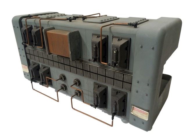This is the only remaining pair from a set of three of miniature Transformer Junction boxes featured prominently at the top of Tony Stark's father's Tokomak. Screen used and fabricated from sintra, cast resin and metal fastener details. 24' long x 12" tall x 10" deep. 1:8 scale. This incredible, handmade miniature is from the celebrated collection of Academy Award winning New Deal Studios. New Deal Studios is a 21st Century Media Studio, unlike any in the world. A full-service film production and visual effects studio, with over 20 years of iconic imagery, New Deal Studios develops, designs, prototypes, and creates all types of high caliber media projects. Founded in 1995 by Matthew Gratzner, Ian Hunter and Shannon Blake Gans, this artist owned and operated independent studio, born in the heyday of visual effects, has truly evolved into the technology driven studio for the future, consistently delivering the perfect marriage of artistry and technology. Award winning credits by New Deal Studios include high-profile projects such as Dark Knight Rises, Hugo, The Avengers, Oz the Great and Powerful, Iron Man, The Dark Knight, Watchmen, I am Legend, Night at the Museum, Whiteout, 2012, Alice in Wonderland, Inception, Battleship and Interstellar.