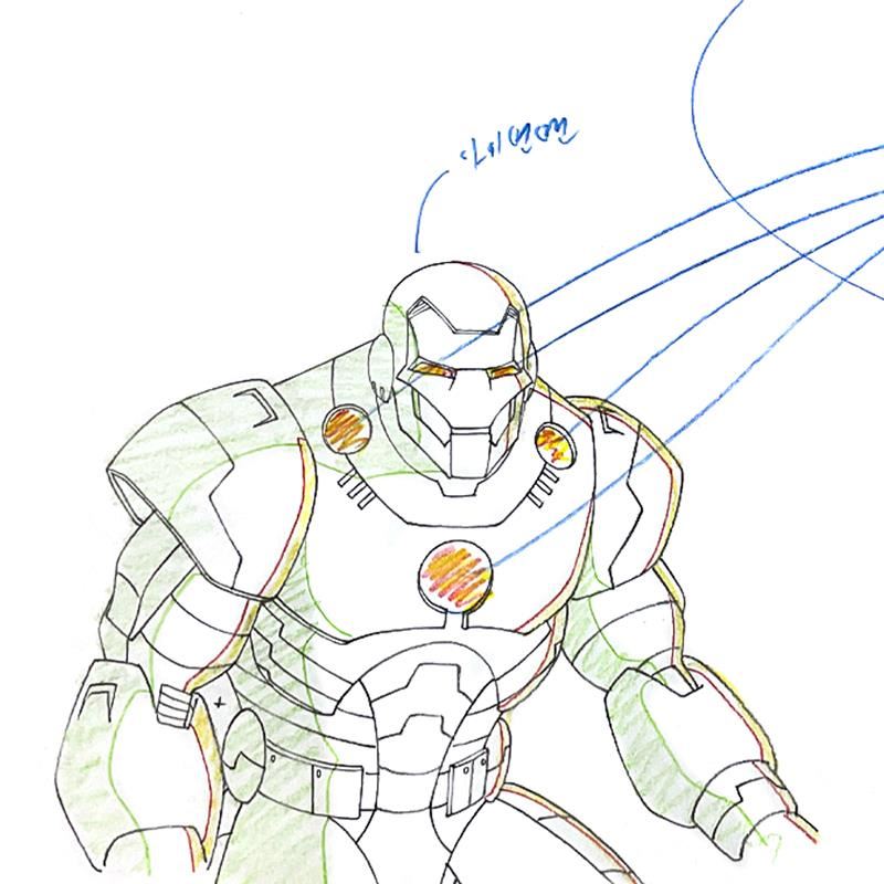 "Iron Man" is an original production drawing on animation paper by Marvel Comics. Includes Letter of Authenticity. Measures approx. 14" x 10" (image).