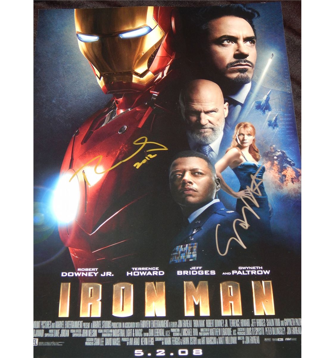 Iron Man – scarce original premiere mini poster from first film dated 2008 signed by Robert Downey Jr in gold ink later dated 2012 and also signed by Gwyneth Paltrow in silver ink