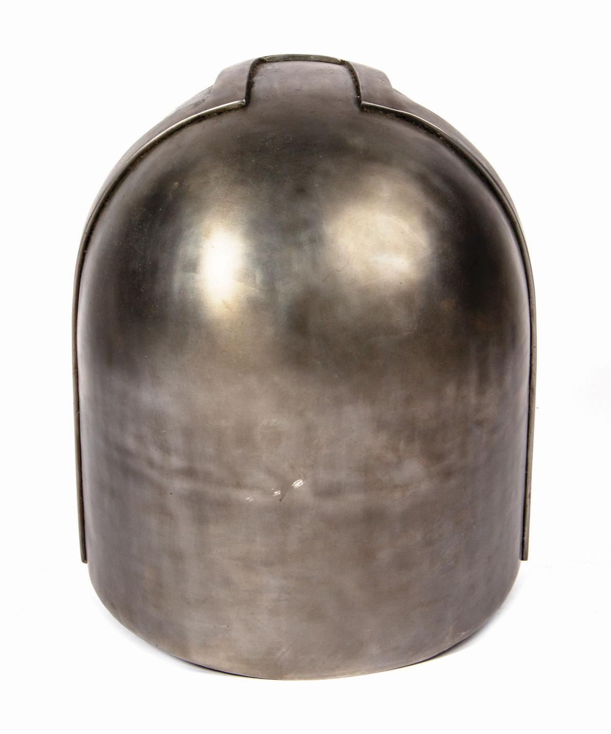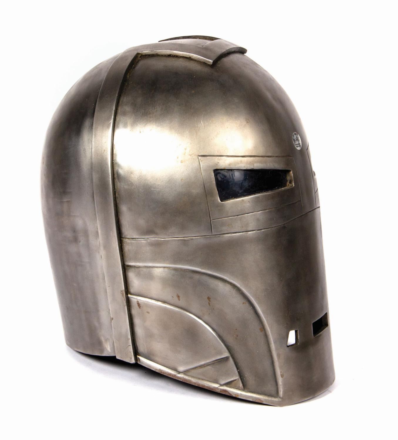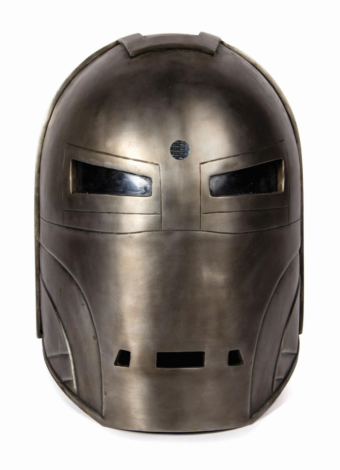 (Marvel, 2008) A limited edition life-size Iron Monger helmet signed by Iron Man creator, Stan Lee. Made by Windlass Studios, the helmet is constructed of hand-forged steel with full internal padding and tinted plastic eye lenses to the exact specs of the screen-used original. In the film, the Iron Monger I-M Mark One armor is created by Stane International from plans for the Iron Man MK 1 stolen from Stark Industries, only made larger to be proportionally stronger. The helmet is signed on the rear interior padding in white paint pen, "Stan Lee," and retains the Stan Lee Collectibles "Excelsior Approved" hologram sticker. Measuring approximately 14"x11.5" and 13" deep, the piece is in fine condition. It exhibits only minor handling wear.