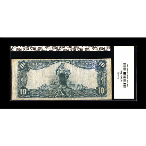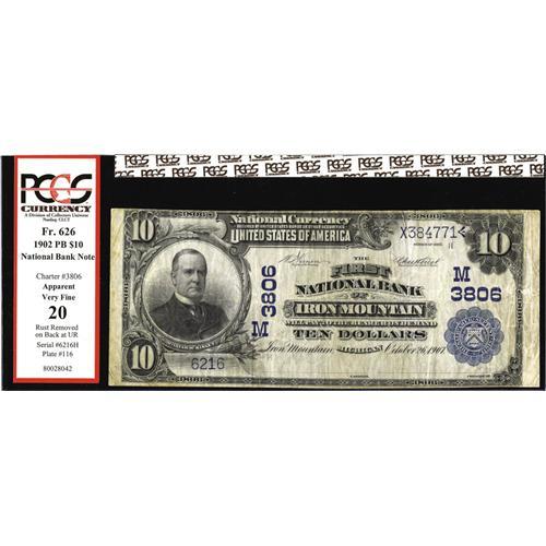<B>Iron Mountain, MI</B></I> - $10 1902 Plain Back Fr. 626 <B>The First NB</B></I> Ch. # (M)3806<BR>The signatures have faded long ago on this tough note which has been red holdered for rust removal. <B>Apparent Very Fine 20</B></I> by PCGS.