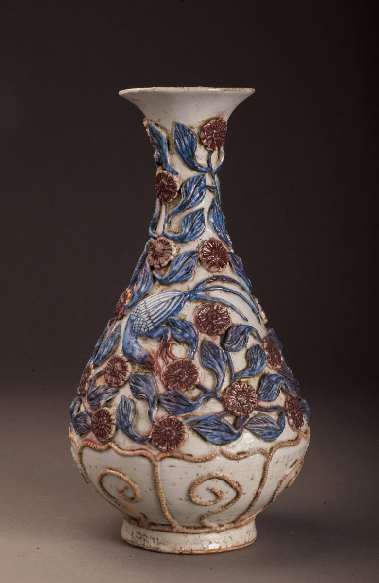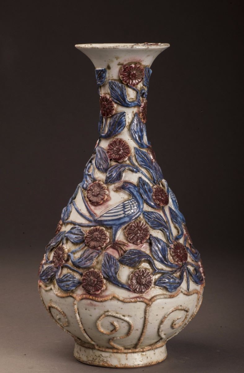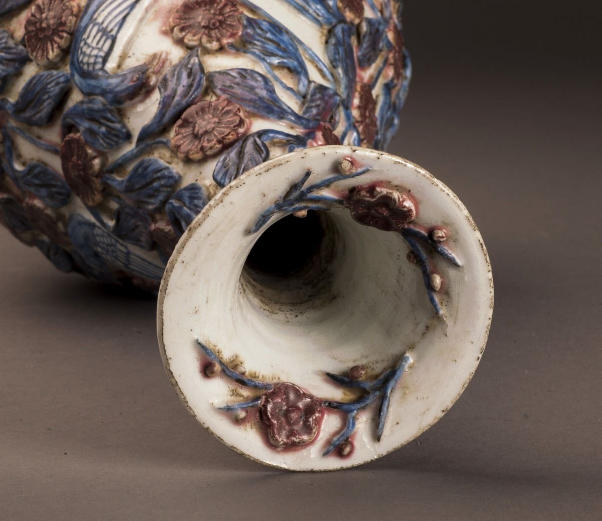 Carved With Delicate Bird In Blue Tone, Designed In Extremely Detail. Decorated With Red Glazed Blooming Flowers At The Main Body. Thin Neck With A Flaring Mouth Top.