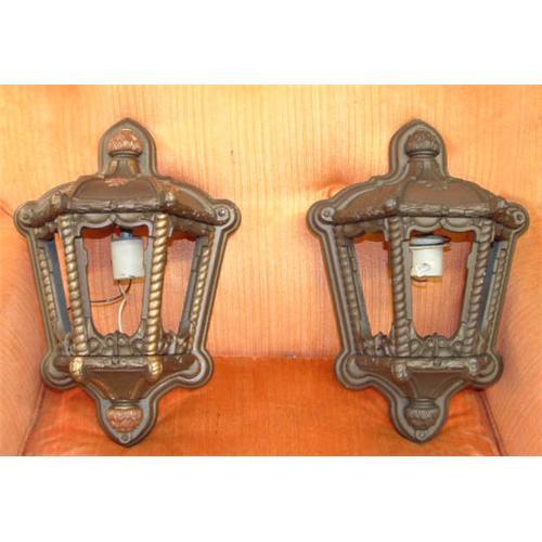 Iron Lantern Style Sconces can be used indoors or outdoors, one single socket; original color; no glass but can have glass inserted;wonderful patina for early 1900's style. Must sell in pairs. 15" tall x 10" wide