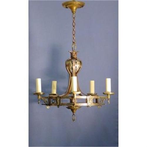 </font></strong>Circa 1910 a bronze and iron five light chandelier ,height 29" diameter 22".All inventory 30 % until february 15.Drop height of chandelier can be modified for most chandelier.</font>