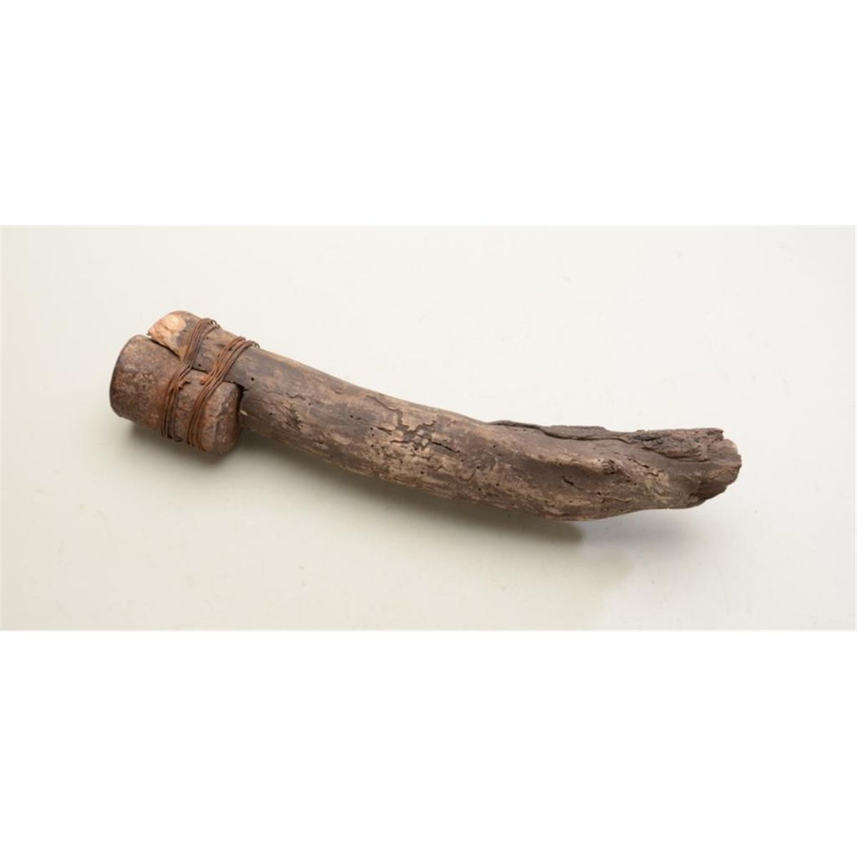 Iron hand cannon approx. 4” overall with an approx. 3” diameter with touch hole and wire wrapped to an old piece of wood approx. 18” in length. Est.: $250-$500.