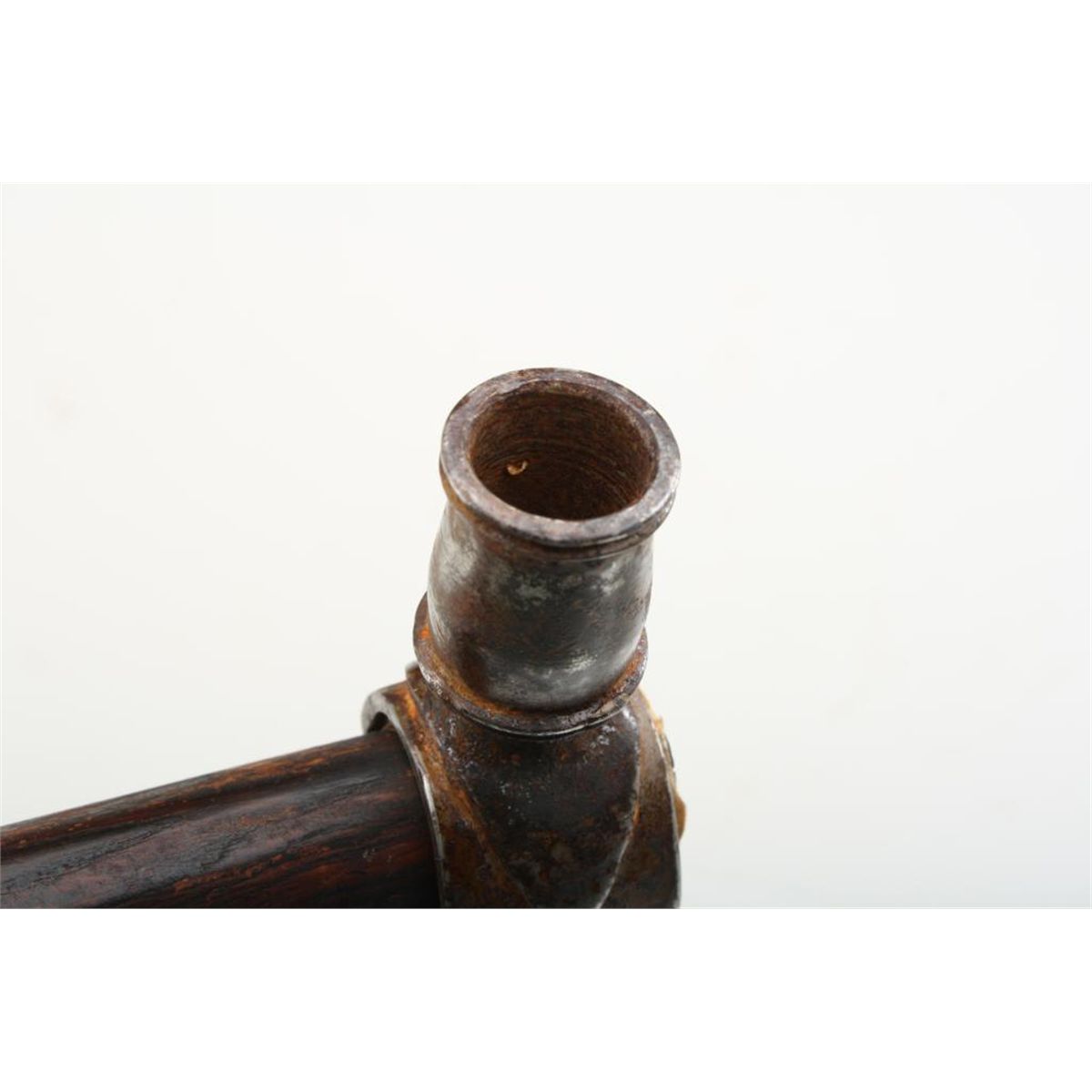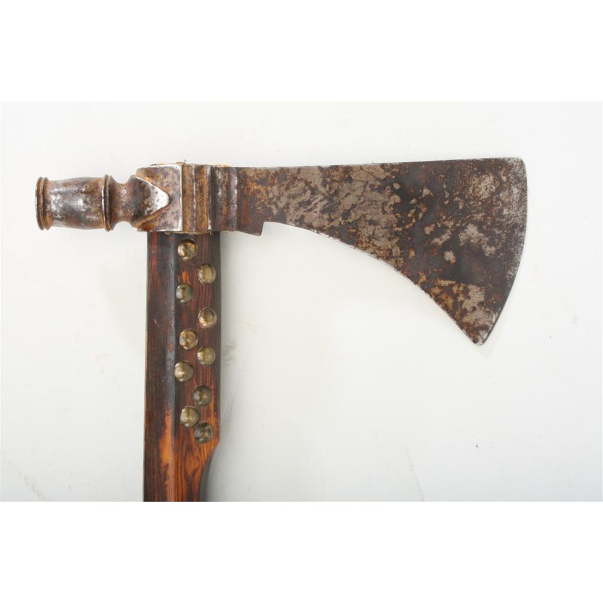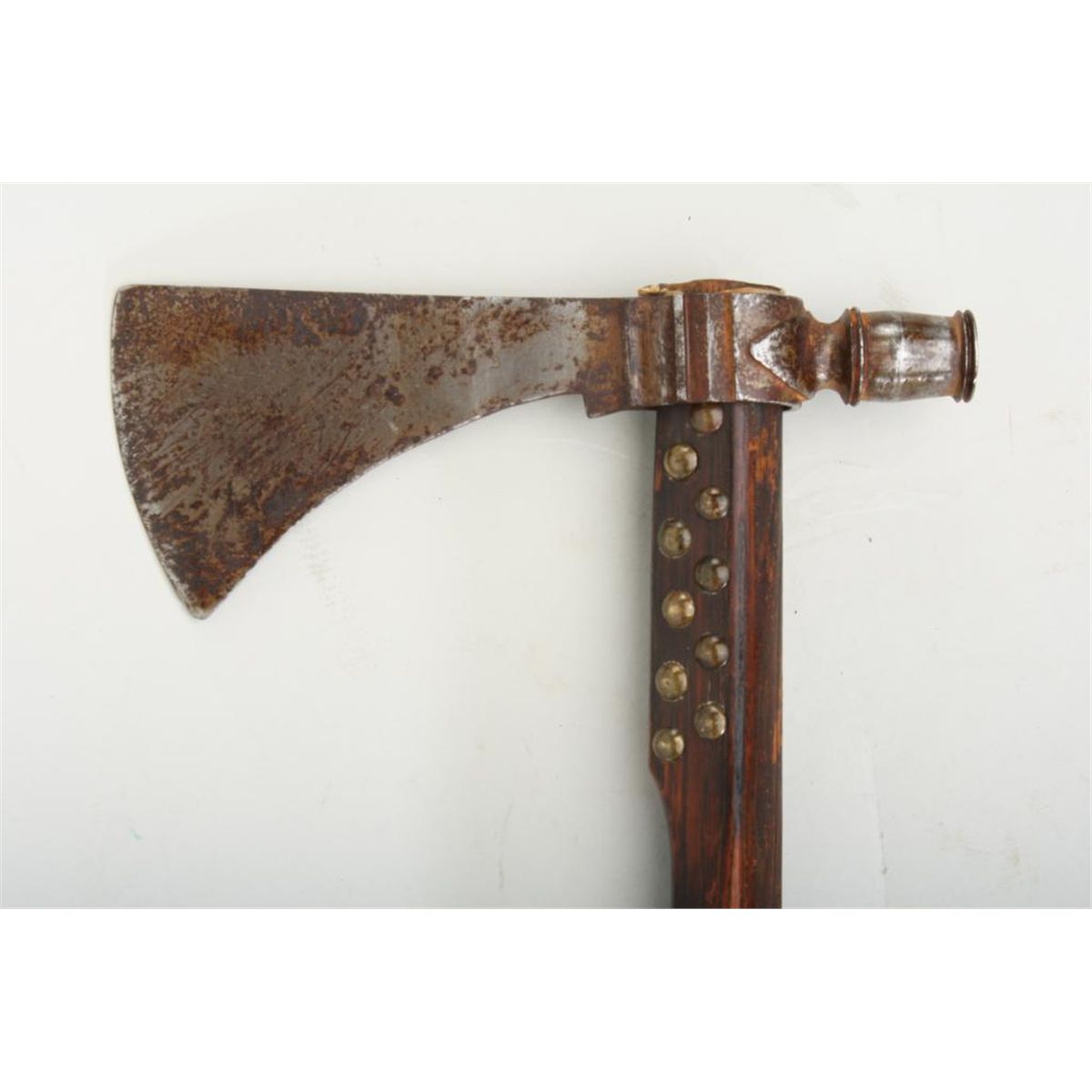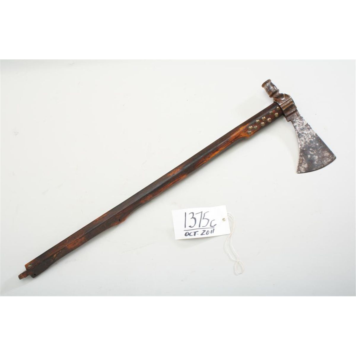 Iron head tomahawk peace pipe approx. 9” overall with scattered spots of erosion and surface rust; accompanied by a wood stem body approx. 24” overall with brass tacked decoration; a good looking piece with lots of character. Est.: $750-$1,500.