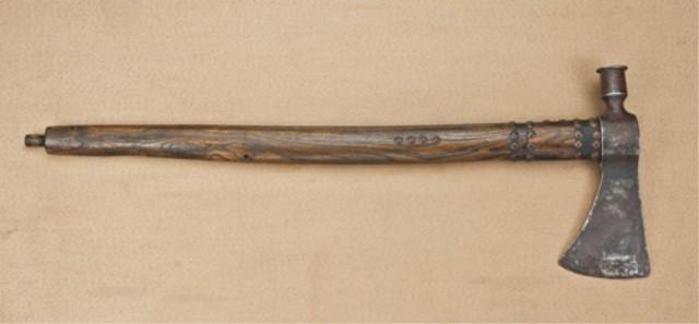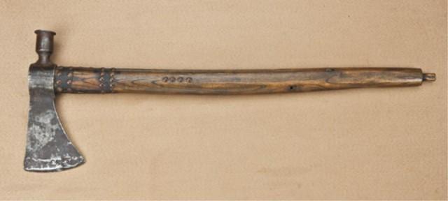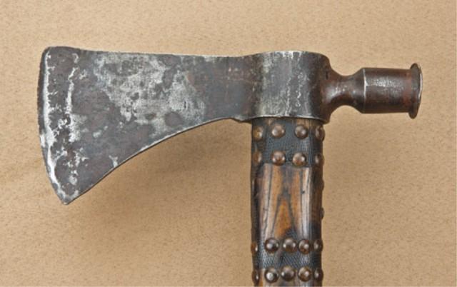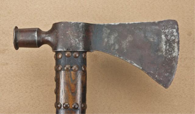 Iron-headed trade-type tomahawk with oak shaft, metal studs, and burnt file decoration, early to mid 19th century. The head measures approx. 8” from the tip of the blade to the tip of the bowl. The blade measures approx. 3-1/4” across widest part of the blade. The head shows forging and is authentic to the period and shows a pronounced lip to the bowl. The head shows forging to add the bowl to the trade-type blade portion. The metal surfaces show light to moderate erosion and pinprick pitting. Some slightly heavier blood pitting at the front. The blade shows sharpening and use. The shaft appears to have been made from hardwood, probably oak, possibly from a table leg, and shows Indian carved edition pipe stem and irregular Indian type drill hole for ornaments. The upper portion of the tomahawk shows burnt-file decoration and the piece is mounted with rusty iron tacks. The shaft appears to be original to the head and shows correct patina around the metal portion where it meets the wood. From the William R. Orbelo Collection. Est: $7,000 - $14,000