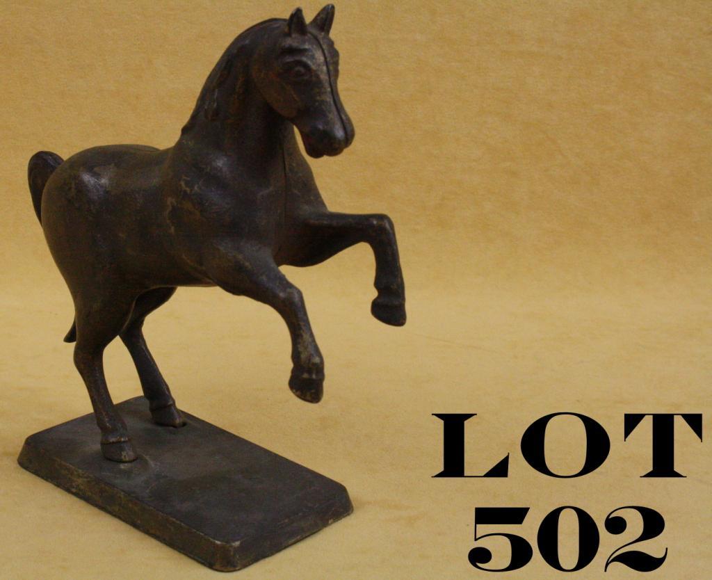 Iron rearing horse bank on stand approx. 8” high with a dark patina and some traces of what appears to be gold paint. Est.: $50-$100.