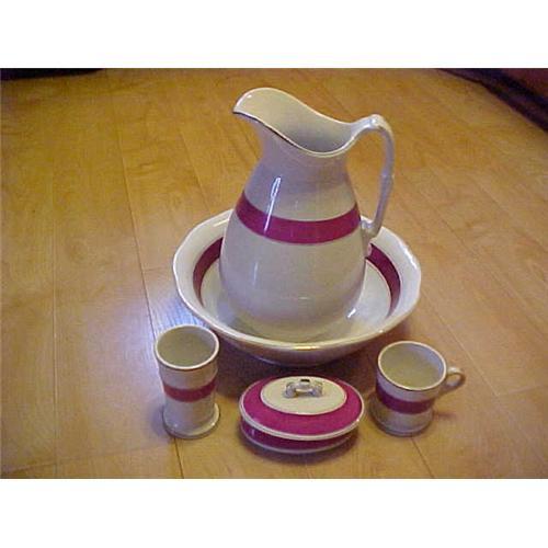 Ironstone Bowl & Pitcher Set, 5 Pcs.,each piece signed Ironstone China J.M. & Co.,Lion and Crown,; 1=14" diameter bowl, red band, gold trim fluted; 1-13" tall matching Pitcher, red band, ; 1 5" tooth brush holder; 1 - 3.5" shaving mug; 1--5.75" X 3.75" oval soap dish; All Pcs. Matching; (c) 1800's; ready for use or display or collection, great for B & B, Country home etc.