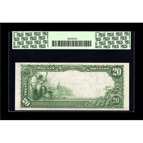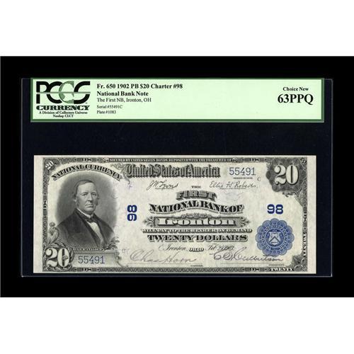 <B>Ironton, OH</B></I> - $20 1902 Plain Back Fr. 650 <B>The First NB</B></I> Ch. # 98<BR>The stamped signatures of Chas Horn, and C.S. Culbertson are noted at the bottom of this wholly original issue. The bottom margin is a touch tight, thus precluding this eye appealing note from a full Gem grade. <B>PCGS Choice New 63PPQ.</B></I><BR><BR><b>Shipping:</b> Coin/Currency (<a target="_blank" href="http://www.heritageauctions.com/common/shipping.php">view shipping information</a>)