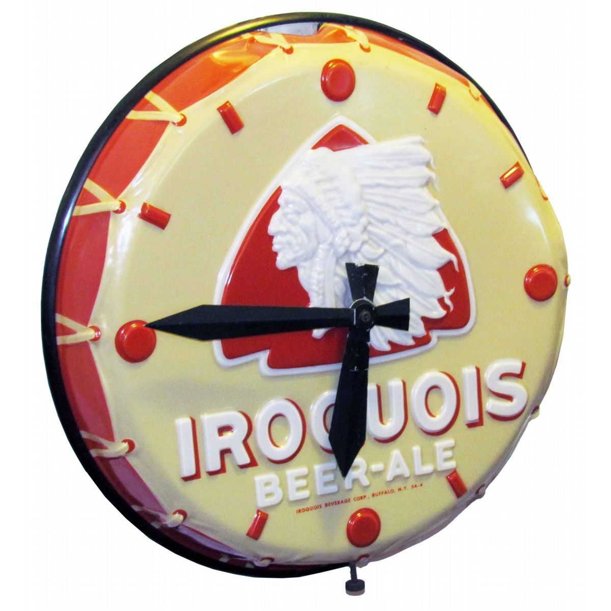Iroquois Beer Lighted Up Back Bar Clock. Heat spot at 12:00 otherwise good working condition. 18 inch diameter.