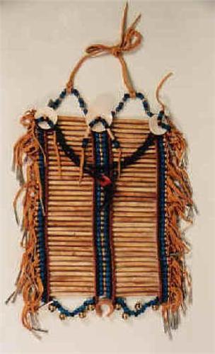 The authentic Iroquois breastplates are made from antiqued bone hairpipe, glass crow beads, brass beads, tin cones, hawk bells, clam shell buttons, and deerskin.