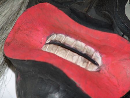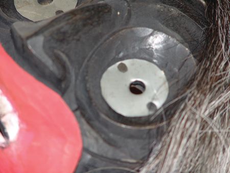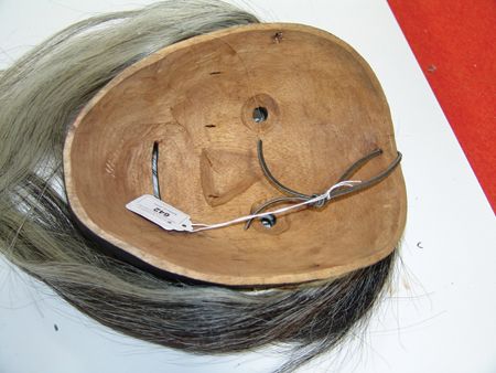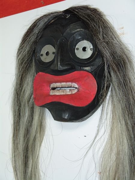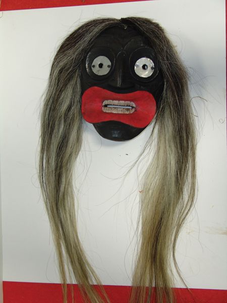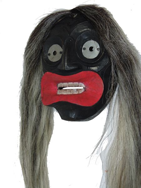 Ca. 1970s, Traditional hand carved and painted "False Face" mask with exaggerated facial features, steel clad eyes, and horsetail hair. Very good condition. 4-1/2" x 10" x 7-1/2" + hair