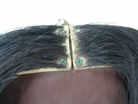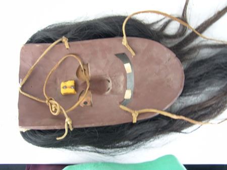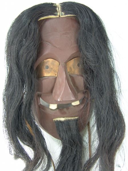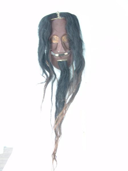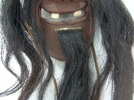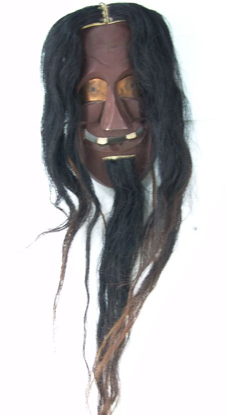 Ca. 1970s, Traditional hand carved and painted wooden "false face" mask with exaggerated features, copper eyes, and horsehair. 15" x 8" x 5" + hair
