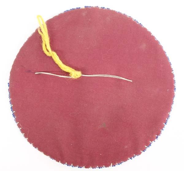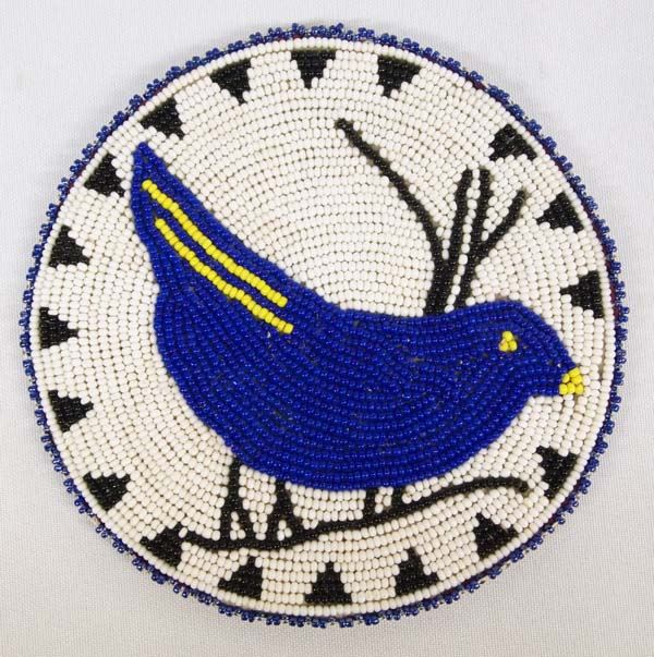 Iroquois Miniature Beaded Bluebird Banner, measures 5.5''D, hand stitched to cloth backing, beautiful colors