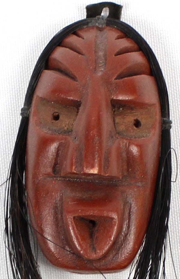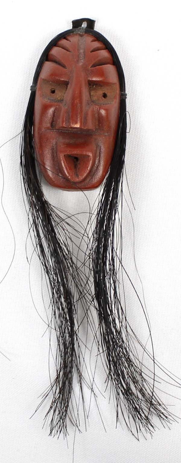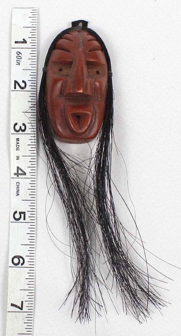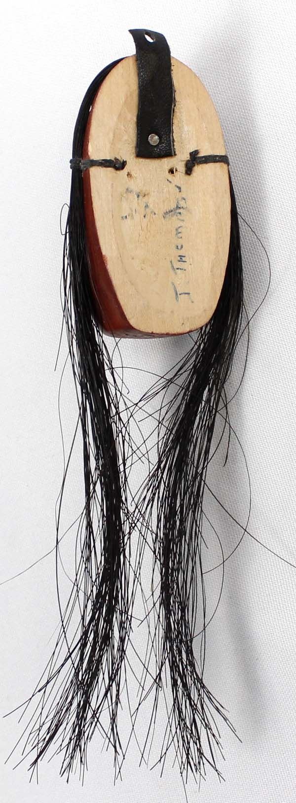 Native American Iroquois Cayuga Miniature False Face Mask by Jacob E. Thomas of the Sandpiper Clan ''Descending Cloud'', measures 1.5'' x 6.5'' which includes horse hair and is signed on the back
