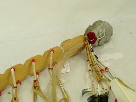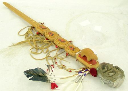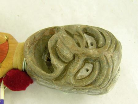 Ca. 1980s, Finely carved soapstone head done in false faced style and with fancy hand carved and painted stem. 24"