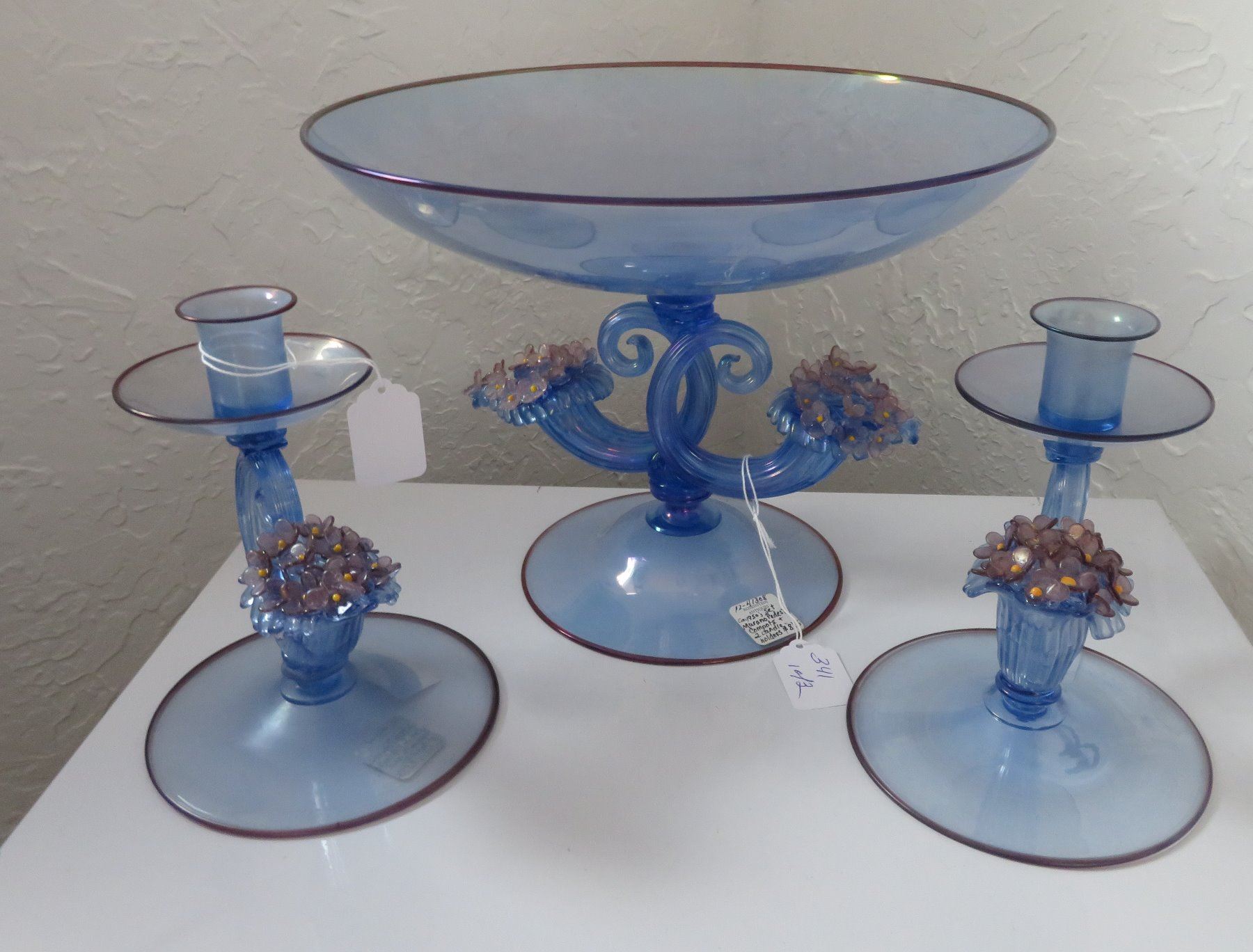 Irradiated Murano Pedestal Compote w/2 Candleholders, c. 1950s. Made of glass and paint, the compote measures 8 1/2" tall x 11 1/4". Candleholders measures 5" tall with 5" base. Nice, small flowers with yellow centers, painted rims. Murano, Italia. Condition: Good, see images. Shipping: $65.00 USA estimate only, due to size and weight, double-boxed.
