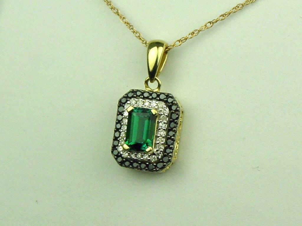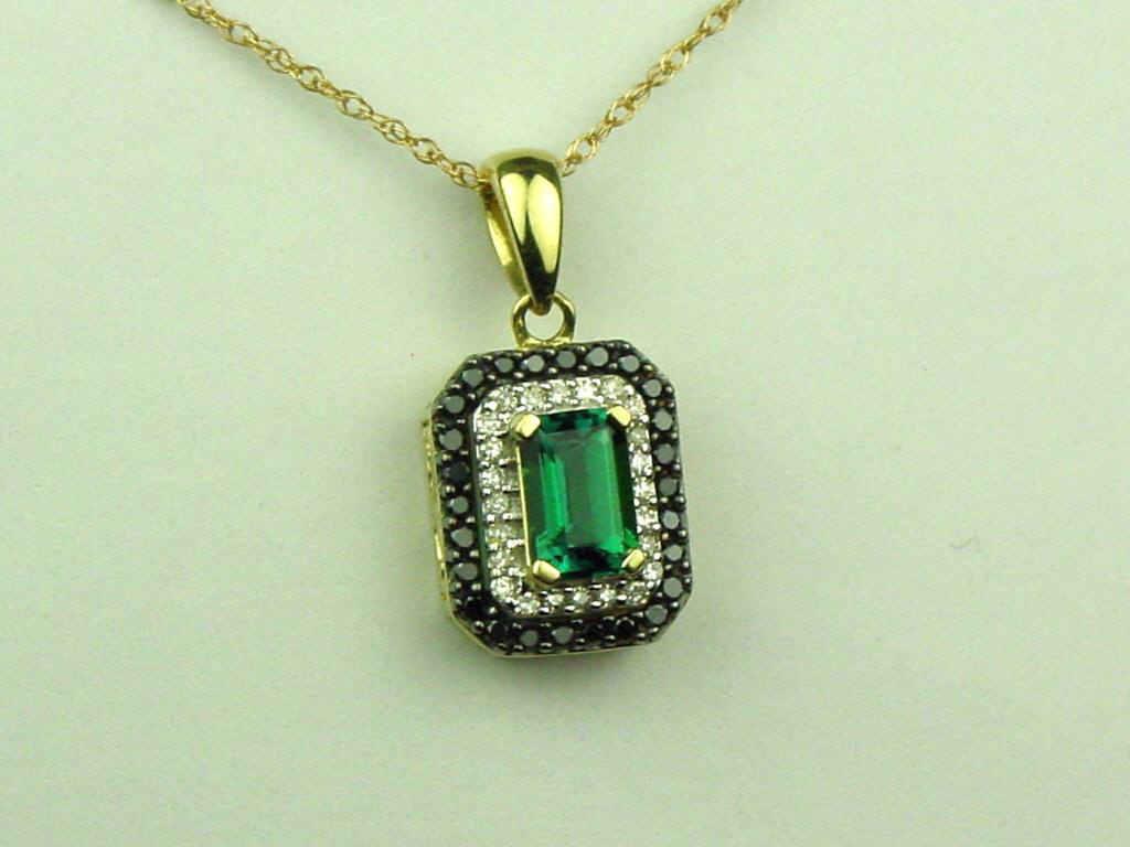 Irresistible 14K Yellow Gold Ladies Necklace Set with a center fine created emerald weighing over 0.80 carats and pave set with over 50 round diamonds of black and H-I colors combination. Retail: $1,650.00Set with a center fine created emerald weighing over 0.80 carats and pave set with over 50 round diamonds of black and H-I colors combination. Retail: $1,650.00