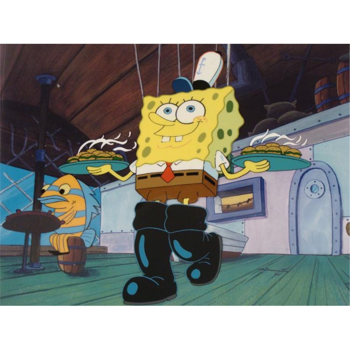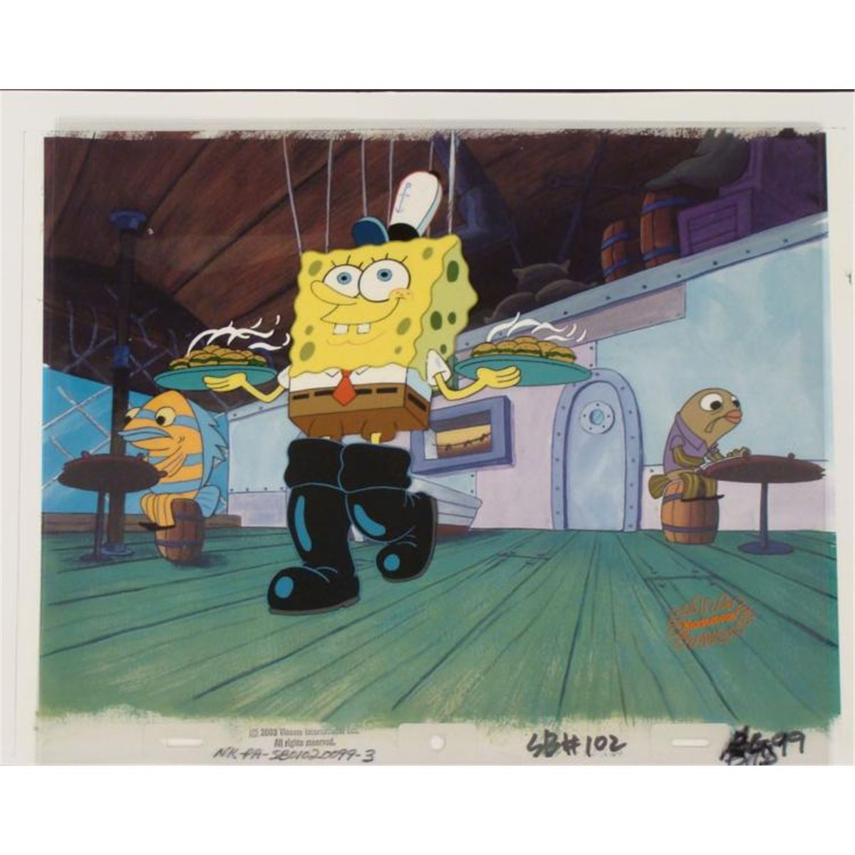 Normal 0 false false false MicrosoftInternetExplorer4 /* Style Definitions */ table.MsoNormalTable{mso-style-name:"Table Normal";mso-tstyle-rowband-size:0;mso-tstyle-colband-size:0;mso-style-noshow:yes;mso-style-parent:"";mso-padding-alt:0in 5.4pt 0in 5.4pt;mso-para-margin:0in;mso-para-margin-bottom:.0001pt;mso-pagination:widow-orphan;font-size:10.0pt;font-family:"Times New Roman";mso-ansi-language:#0400;mso-fareast-language:#0400;mso-bidi-language:#0400;}This animation cel and reproduction background are from the Nickelodeo nTV show SpongeBob Squarepants. The story takes place under the deep blue sea in Bikini Bottom, where SpongeBob resides. SpongeBob, who is a yellow, porous sponge, is your typical happy-go-lucky character, as he is always cheerful and enjoys making people laugh. Patrick Star, SpongeBob's neighbor who is a starfish, is your average children's show idiot, as he boasts knowing nothing and is often getting himself into ridiculous situations.Between the homes of these two lies the home of the miserable Squidward, a squid, who is known for being grouchy and playing tricks on SpongeBob an dPatrick. Both SpongeBob and Squidward work at the Krusty Krab, a fast food business run by the greedy money-loving Mr. Krabs, a crab, the arch rival of the evil, possibly misunderstood, Plankton. Another neighbor, Sandy Cheeks, an athletic squirrel who normally wears an astronaut's space suit, was introduced in "Tea at the Treedome." She spends most of her time inventing and experimenting. * Who wants these mouth-watering, eye-dropping, Krabby Patties?? * * Original Printed Background and Animated Cel Overall Size of Background: 11" x 17" Overall Size of the Cel: 10 1/2" x 12 1/2" Very good condition This is an original hand-painted cel set-up used in the production of an episode of "SpongeBob SquarePants", titled Squeaky Boots Each one-of-a-kind set-up represents a slight change in position of the characters. When individually photographed and projected in rapid succession, the images appear to move. * To create production cels, the original animator's drawing is transferred onto an acetate cel (by hand-inking and/or photo copying). The cel is then hand-painted on the reverse side. The background accompanying this set-up is a reproduction background. * The printed background and cel are ready to be matted and framed. The notations are located at the bottom of both. The cel is multi-layered: first is the steam from the Krabby Patties, then is Spongebob, followed by two fishes waiting for their food. The Nickelodeon logo is located at the bottom right of the second cel. There is some paint fade to Spongebob's and two fishes outline. *