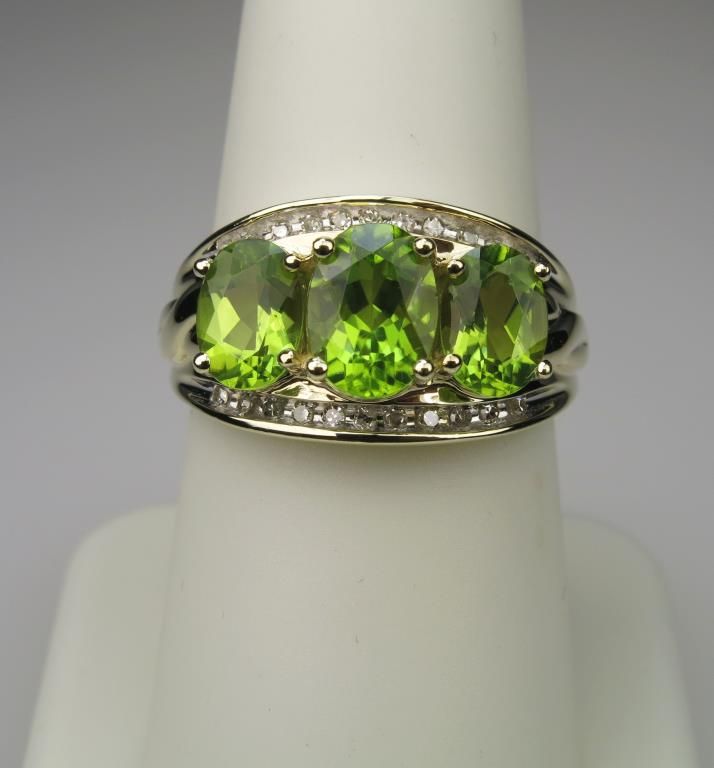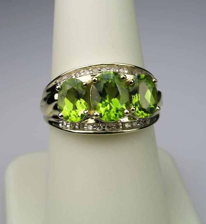 Irresistible Peridot and Diamond Ring with 3 oval Peridot weighing approx. 4.00 carats total with 22 round channel set Diamonds set in 10 karat yellow gold. Retail $700-$1,000 Estimate $400-$600