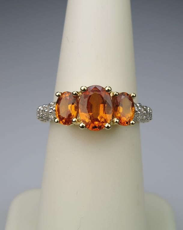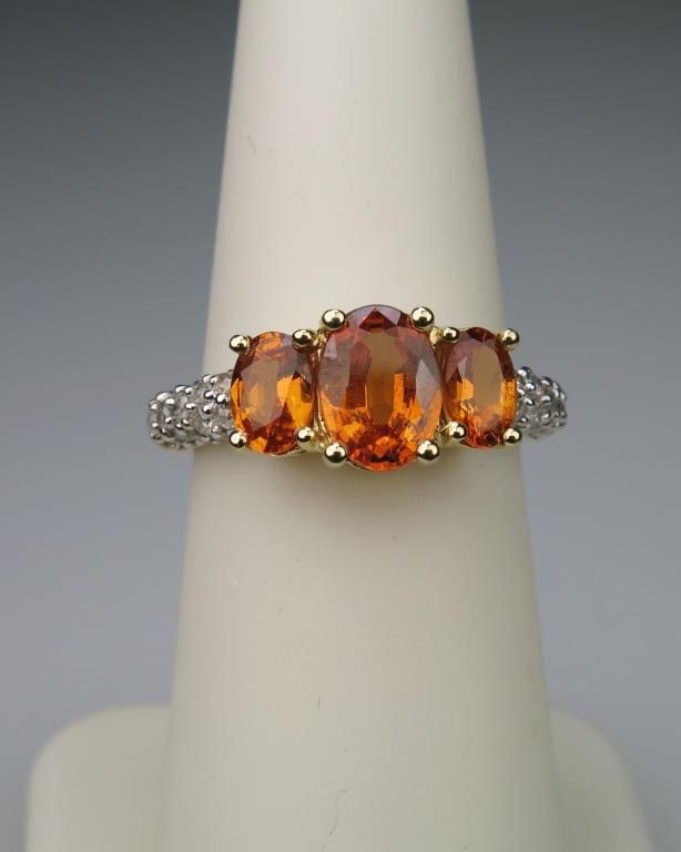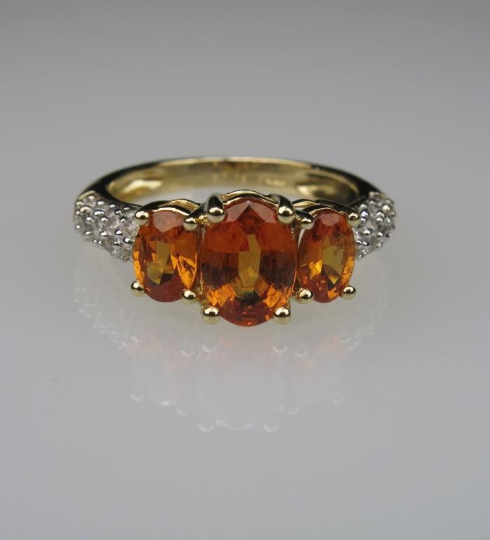 Irresistible Triple Orange Sapphire and Diamond Ring with 3 oval Sapphires weighing approx. 2.00 carats total with 30 pave set round cut Diamonds weighing approx. 0.40 carats set in 14 karat yellow gold. Nice. Retail $2,000 -$2,500Estimate $1,000-$1,500