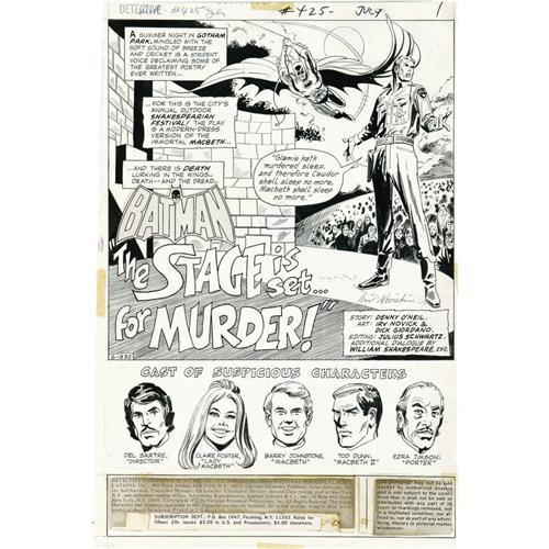 <B>Irv Novick and Dick Giordano - Detective Comics #425, Splash Page 1 Original Art (DC, 1972).</B></I> This dramatic page features the dark knight detective as he swings headlong into a mystery built around the cast of a Shakespearean festival, in this splash page opener for "The Stage is Set For Murder." Irv Novick's superb pencils are given the perfect Bronze Age finish with inks by Dick Giordano. This splash has an image area of 10" x 15", and aside from aging indicia type stats, the page is in Excellent condition. <BR><BR><B>Important notice:</B> Heritage usually auctions material at the rate of 200-250 lots per hour. On some occasions eBay Live bid software or the Internet may not be able to keep up with the pace of the auction. We recommend placing a realistic absentee bid now as insurance to avoid disappointment. Occasionally the auctioneer may eliminate or reject an eBay Live bid, and the auctioneer may also reopen a lot after the close of the eBay live bidding (usually because we missed an audience bid), and may reject your bid even if it shows you as the winning bidder. By bidding via eBay Live, you agree that Heritage may award the lot to another bidder at its sole discretion under the circumstances described above or any other reasonable circumstances. Since eBay bids are not shown to us until we open the lot on the floor, we treat those bids just like floor bids. In most cases the floor responds before the eBay bid is presented to us, due to Internet lag time, so for consistency we have made it a policy that floor bids are always considered first over tie eBay live bids. Also please note that all Heritage lots purchased through eBay Live carry a 22.5% Buyer's Premium. Please make sure you read the Terms and Conditions before you bid. This lot is being auctioned in conjunction with a live floor auction by Heritage Auction Galleries. All final auction and invoice information will be supplied by Heritage Auction Galleries, and all other information should be considered preliminary. Lot:41001 <BR><BR><B>Winning Notification and Billing:</B> After the FINAL session in this auction is complete, Heritage will send e-mail and snail mail invoices. This process normally takes several days. All final auction and invoice information will be supplied by Heritage Auction Galleries, and all other information should be considered preliminary. <BR><BR>This auction will be conducted on a live auction floor and over the Internet through eBay Live. If you choose to place an absentee bid, please take a moment to <font color='#0000ff'><u><a href='http://pages.ebay.com/liveauctions/help/before/laabsentee.html'>learn how eBay Live absentee bidding works</a></u></font><font color='#000000'>