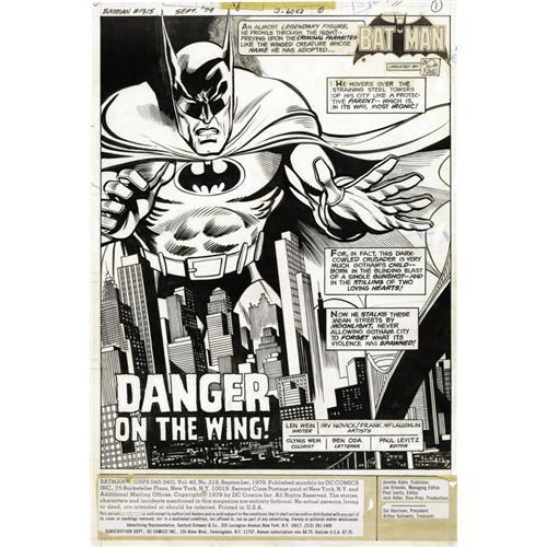 <B>Irv Novick and Frank McLaughlin - Batman #315, Splash Page 1 Original Art (DC, 1979).</B></I> Irv Novick spotlights Batman, the legendary crimefighter of comics, as he prowls through the Gotham City night preying upon the criminal parasites like the winged creature whose name he has adopted. What more could any Bat-fan desire from a splash page? This symbolic scene has an image area of approximately 10" x 13". The title logo and other type stats show mild signs of aging; otherwise, the page is in Excellent condition.<BR><BR><b>Shipping:</b> Small Flat (<a target="_blank" href="http://www.heritageauctions.com/common/shipping.php">view shipping information</a>)
